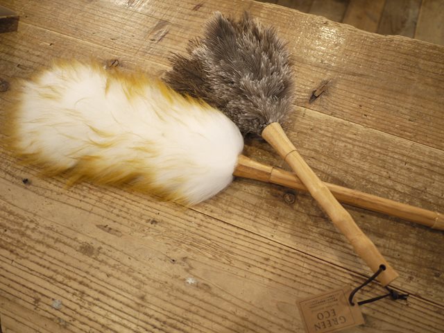 グレーのハンディーダスターは、ダチョウの羽で出来ているのでデリケートな表面も傷つけず掃除できます。